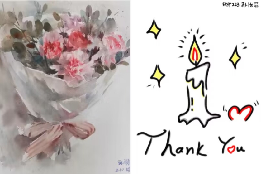 活动中,有的同学们通过水彩画表现出与老师之间深深的羁绊,他们把对老师无尽的感激之情融入到每一笔每一划之中;也有的同学融合了专业能力,将AI绘画与本次活动结合起来,并通过新的艺术形式讲述着属于自己与老师之间的故事。这不仅展现了同学们的艺术才华,也让同学们更加深刻地感受到了师生之间深厚的情感。