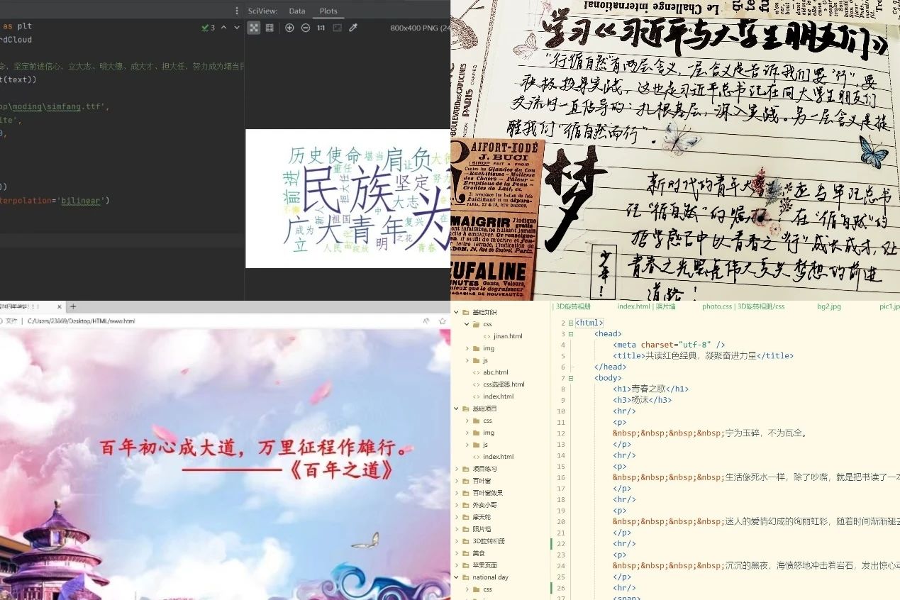 本次活动中,同学们采用多种形式呈现学习成果。同学们利用专业课所学,将自己对于书籍的理解和感受以及对祖国生日的美好祝愿以代码编程的形式表达出来,展现信院特色。同学们积极制作了阅读笔记、手账等,记录了他们在阅读过程中的收获和感悟,通过摘抄书籍中的相关语句,认真阅读,反复思考,并深入领会作者的思想和情感表达,更好地融入到书中的故事里。这些笔记不仅记录了书籍中的重要观点,还结合了个人的理解和思考,将书籍中的观点与自己的成长紧密结合,激励自己不断奋进、追求理想。