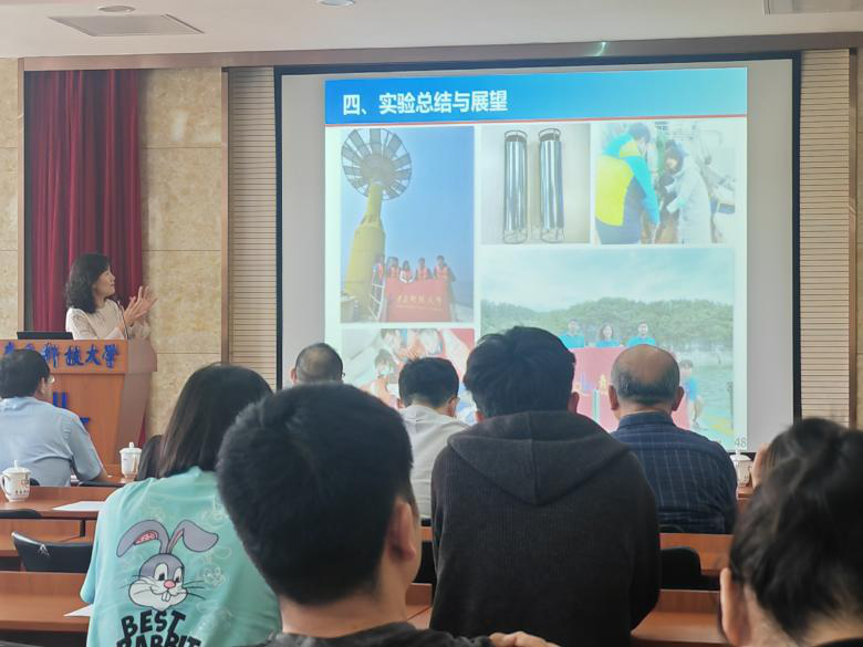 王景景首先对面向复杂海洋环境的高可靠智能水声通信技术及装备的研究背景及重要意义进行了分析阐述,并介绍了其在智能海洋通信技术领域中的重要成果:水声信号智能识别与生成技术。她激励同学们要做专业基础宽厚、创新能力突出、意志坚定、视野开阔的信息领域高层次人才。