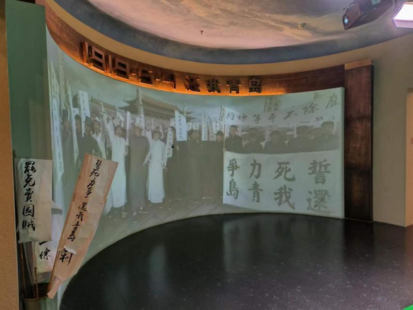 图为多媒体还原的“誓死力争,还我青岛”现场视频以及一旁游客可以举起的纸旗道具 张赛玉 摄