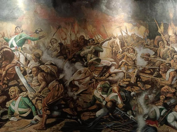 大型油画《蓝村袭击战》是青岛一战遗址博物馆的镇馆之宝,讲述的是青岛近郊民众英勇抗击德军的故事。德国在修筑胶济铁路的期间,掠夺土地、侵害沿途民众利益。其中在高密,由西乡农民孙文领导的大规模民众抗德斗争,迫使胶济铁路修筑工程停工达一年之久,此次事件在山东近代反帝斗争史上产生了重大影响。