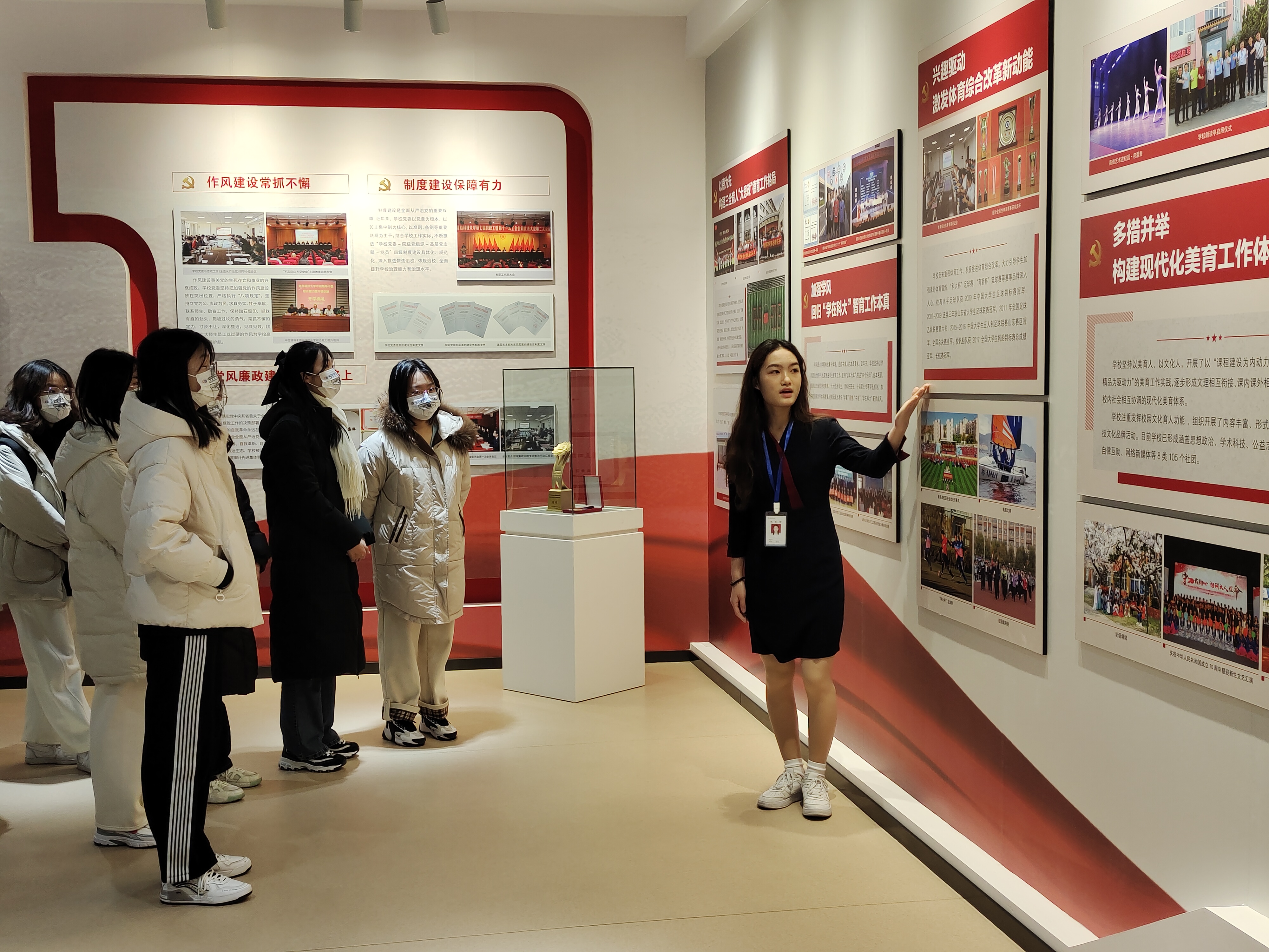 校史馆讲解员详细介绍了青科大的发展,一张张照片展示了科大建设的历程。在讲解员带领下,青马学员行走在展馆里,仿佛穿梭在时空隧道中,让学员们深刻感受到学校发展之快,作为青科人的自豪感和使命感油然而生。穿越轮胎门,讲解员自豪地讲述青科大在学科建设、科技创新等9个方面取得的硕果。学员们耐心听讲,了解了科大建校以来取得的突出成就,伟大成就鼓舞人心,美好蓝图催人奋进!