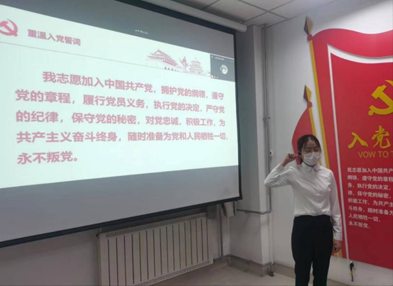 党员代表陈鹏运同学就“中国共产党的诞生”发表演讲,2022年是中国共产党成立101周年。一段岁月,波澜壮阔,刻骨铭心,一种精神,穿越历史,辉映未来。激励同学们要以习近平总书记重要讲话为遵循,做到学党史、悟思想、办实事、开新局,大力发扬红色传统、传承红色基因,不断从党史中汲取前行的力量。公烁同学就“焦裕禄精神”发表演讲,学习弘扬焦裕禄精神,就是要学习他严于律己、脚踏实地的工作作风。严于律己是增强组织战斗力的重要基础,常怀律己之心,以身作则,是对党的事业的高度负责,也有利于个人的健康成长。会议最后,党员代表聂海萍带领大家重温入党誓词。