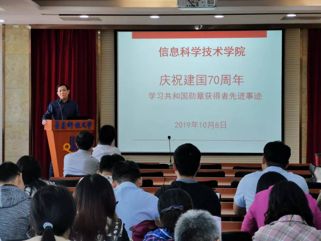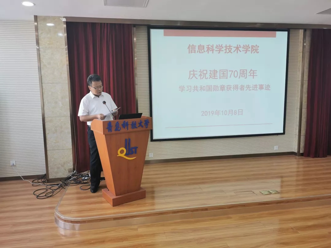 为庆祝中华人民共和国成立七十周年,贯彻落实“不忘初心、牢记使命”主题教育要求。10月8日,信息学院于402会议室召开大会学习共和国勋章获得者先进事迹。学院全体教师参加会议,会议由党总支书记刘庆主持。