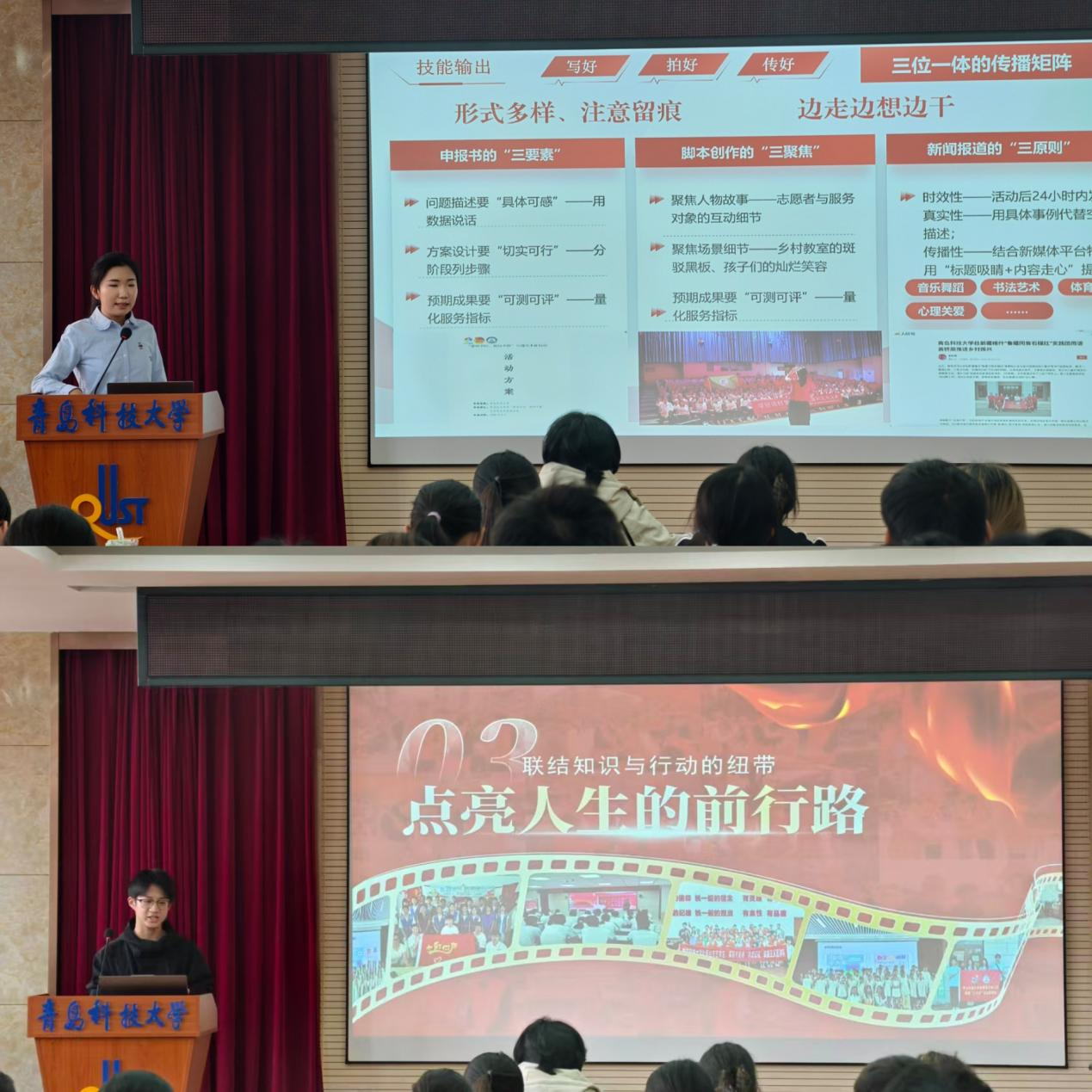 “鲁疆同音石榴红”推普助力乡村振兴实践团成员物联222班刘雨涵分享了在新疆喀什以语言为媒,凝聚民族情感,架起鲁疆交流的“连心桥”的故事。星火e+志愿服务队负责人微电子232班王杰琪分享了自己用专业所长回应社会需求,以青春热血书写时代担当的实践经历。2025级网安专业学生张鹏泽感慨到:“以前觉得社会实践是‘任务’,现在才明白它是‘成长的必修课’。今天的分享让我明白,用专业知识服务社会,既能实现个人价值,也能为国家发展贡献力量。”