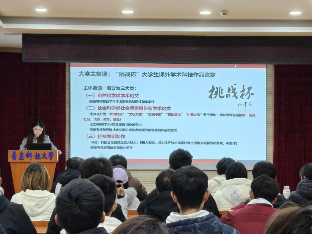 “鱼”音绕“粮”项目团队代表孙悦、孟书宇分享“挑战杯”获奖经验,从PPT逻辑架构、团队分工协作、支撑材料准备等方面进行分享,并结合自己参赛的亲身经历为大家讲述“避坑指南”。交流环节中,学生们围绕“队伍组建”“计划书撰写”等问题积极互动,现场氛围热烈。